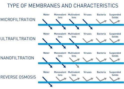 غشاهای نیمهتراوا بر حسب اندازه منافذ، به ترتیب از بزرگ به کوچک به غشای میکروفیلتراسیون (MF)، غشای اولترافیلتراسیون (UF)، غشای نانوفیلتراسیون (NF) و غشای اسمز معکوس (RO) طبقهبندی میشوند. در شکل زیر انواع آلایندههایی که هر یک از غشاهای نیمهتراوا قادر به حذف آنها هستند، نشان داده شده.